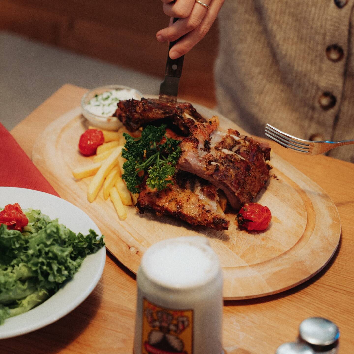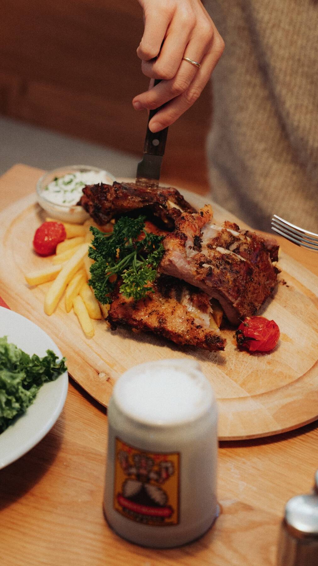 Saftige Ripperl frisch aus dem Ofen – mit Krautsalat, knusprigen Pommes und einem kühlen Bier dazu.