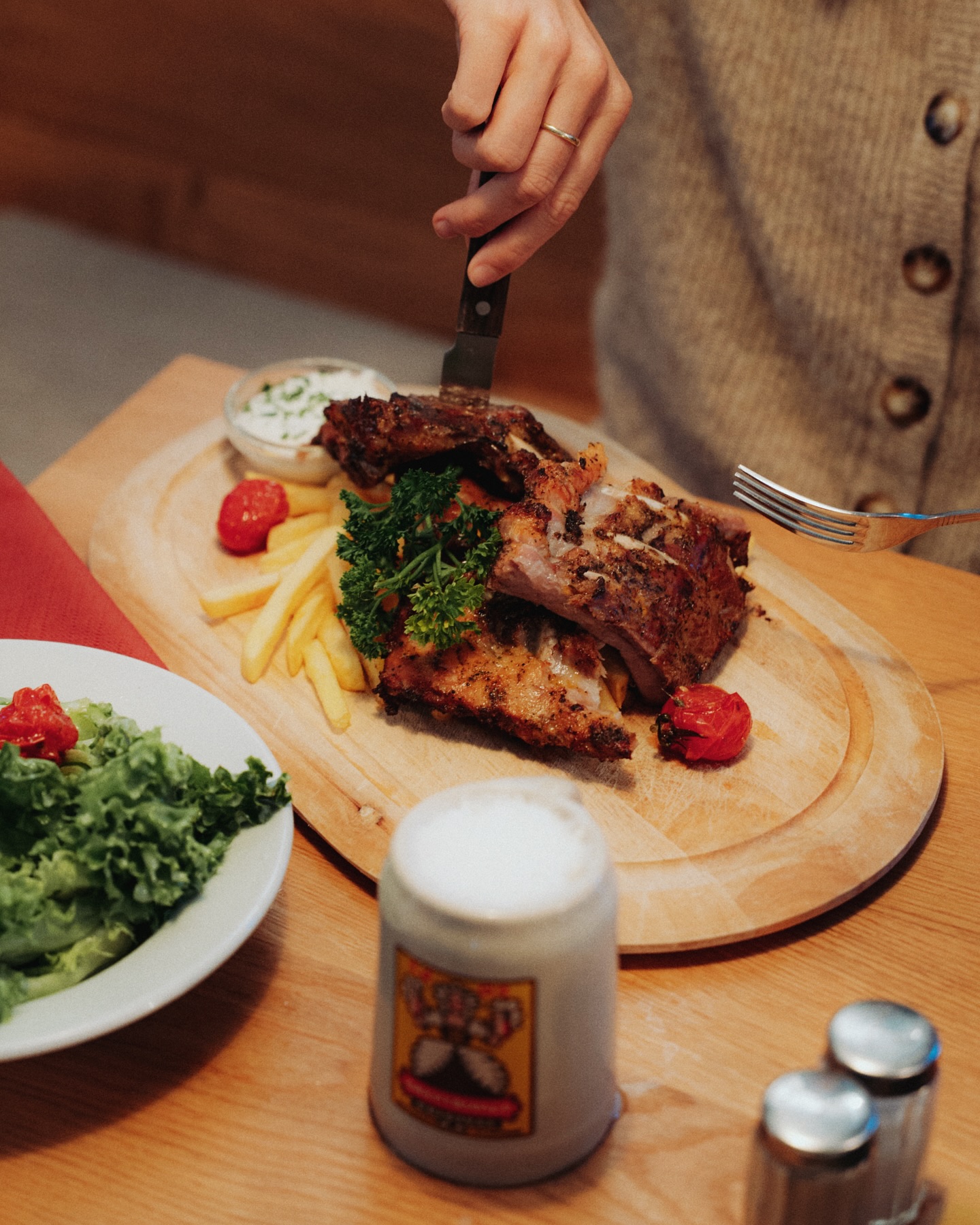 Saftige Ripperl frisch aus dem Ofen – mit Krautsalat, knusprigen Pommes und einem kühlen Bier dazu.